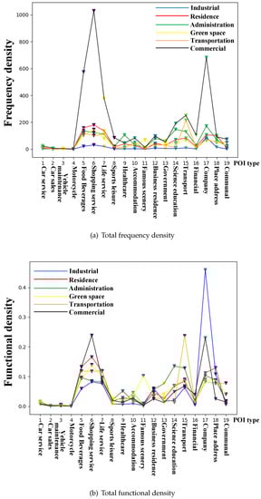 To verify the correctness and rationality of the classification method based on POI data, the mean frequency density and mean functional density of each urban functional regions are visualized in Figure 11 and the comparison in Figure 12. From Figure 11 and Figure 12, we find that the mean spatial distribution of various urban function regions is discrepant, which reflects the main functional attributes of the specific urban area to some extent. In addition, we can obtain the following phenomenon: