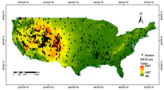 Given the widespread distribution and large number of ground-based SM observations in the U.S. (Figure 1), this region (67°03′W–124°76′W and 25°24′N–49°39′N) was selected as the study area in this paper. Most parts of the study area have continental and subtropical climates, with average temperatures in January and July ranging from −3 °C and 24 °C in the northern part to 11 °C and 28 °C in the southern part, respectively. The average annual rainfall in the area decreases from 1500 mm over the central plain and Pacific coasts to 500 mm over the western plateau, where the highest elevation is 4187 m.