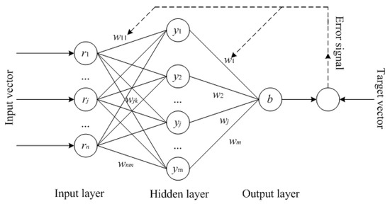 Suppose a three-layer BPNN has n inputs, m neurons in the hidden layer, and one output (Figure 4). The weights and thresholds from the input to hidden layer are wjk and θk (j = 1, 2, …, n; k = 1, 2, …, m), and the weights and thresholds from the hidden to output layer are wk (k = 1, 2, …, m) and θ, respectively. Then, the kth unit of the hidden layer (yk) and the output of the output layer (b) can be given as Equations (8) and (9), respectively.