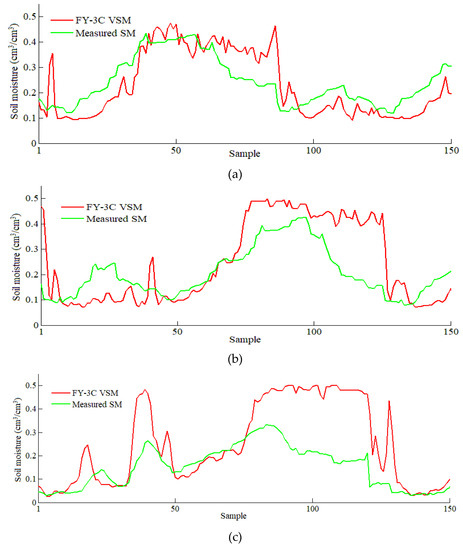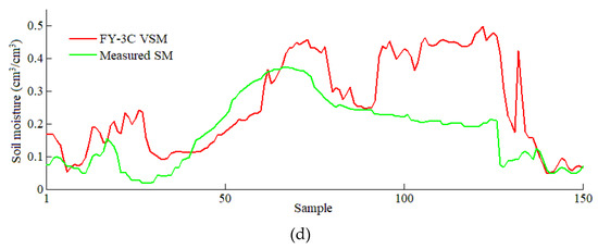 To assess the consistency between the FY-3C VSM and the measured SM in different seasons, pixel values were extracted from FY-3C VSM images and the measured SM from the ISMN in January, April, July, and October 2019. Considering the periodic change of SM curves between different rows, the pixels in one cycle were representative and should be selected to describe the over- and underestimation issues of FY-3C VSM directly. Here, 150 pixels were selected randomly from the central rows with the latitude ranging from 32.19°N to 32.74°N in each month for comparison between the FY-3C VSM product and measured SM. The variation curves of FY-3C VSM (red line) and measured SM (green line) are displayed in Figure 5. Generally, the varying patterns of the FY-3C retrievals were basically consistent with the in situ SM values in most samples during the four months, especially in January (Figure 5a), whose pixel values from both sources were distributed between 0.10 cm3/cm3 and 0.45 cm3/cm3. In February 2019 (Figure 5b), the FY-3C VSM sample values from 10 to 50 were basically lower than the SM measurements, and the sample values from 70 to 130 were mainly higher than the measured SM values. It was obvious that the FY-3C satellite retrievals in July 2019 (Figure 5c) overestimated the SM in almost of the samples, and the estimation error was significantly greater than that in the other months, which was possibly due to the potential impacts caused by factors such as deep and widespread vegetation coverage in summer. The curves for October 2019 (Figure 5d) indicated a similar situation to that in July, although the proportion and degree of overestimation were slightly decreased compared with those in July. To further evaluate the vegetation impact on the FY-3C VSM retrieval accuracy in July, the SM deviations between the FY-3C VSM and the measured SM were calculated and compared to the MODIS NDVI by plotting the variation curves and evaluating the correlation between the two sources. The plot could be found in the Appendix A, where the curves of the MODIS NDVI (red line) and the SM deviations (green line) showed a similar variation pattern and the R value was 0.666, which indicated a strong correlation between the NDVI and SM deviation.