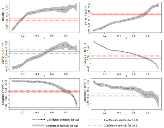 In Figure 6, the dependent variable, i.e., the measured SM, was plotted against quantiles from 0.05 to 0.95 for five independent variables, including the FY-3C VSM retrievals, MODIS NDVI, latitude, longitude, and elevation, and an intercept using the “quantreg” package in R (https://www.R-project.org/). The plots depicted the variation pattern of coefficient estimates and 95% confidence intervals of all independent variables and intercept. According to Figure 6, the FY-3C VSM had a positive correlation with the measured SM at all quantiles, and the QR coefficient estimates increased from 0.01 in the lower quantile to 0.22 in the upper quantile. The estimate from the OLS method was constant at approximately 0.14, which suggested that the estimated SM using OLS was likely to be overestimated in areas with low soil water contents (dry) and underestimated in areas with high soil water contents (wet). Apart from the FY-3C VSM, the MODIS NDVI had negative estimates at quantiles from 0 to 0.2 and positive estimates at quantiles from 0.2 to 0.95. The coefficient estimates showed an increasing trend before reaching their peak (0.06) at quantile 0.8 and then slightly decreased to 0.04. The latitude and elevation had both negative (quantiles 0.8–0.95) and positive (0.05–0.8) effects on SM, and the latitude was more significant than elevation at all quantiles. The longitude had a positive correlation with SM at all quantiles, and its coefficient estimates decreased from the lower to upper quantiles.