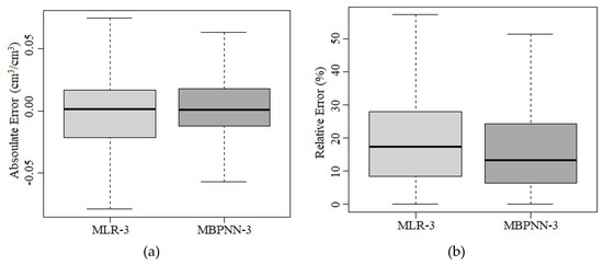 (a) Absolute errors and (b) relative errors between the measured and estimated SM using MLR-3 and MBPNN-3 models.