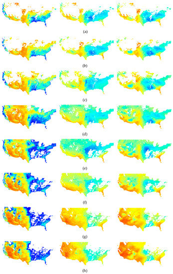 Here, the MBPNN-3 model was applied to estimate the regional SM in the study area from January to October 2019, as shown in the middle column of Figure 8. The images in the left and right columns are the FY-3C VSM retrievals and the measured SM from the ISMN. In general, the FY-3C VSM products overestimated the SM in the eastern part and underestimated the SM in the midwestern part of the U.S. during the 10 months. It was evident that the spatiotemporal variation patterns of the SM estimations using the MBPNN-3 model were more consistent with the in situ SM measurements than those using the FY-3C VSM products. The over- and underestimation issues were reduced in the estimated SM images throughout the study area, especially the overestimation problem in the western and northeastern parts, indicating that the MBPNN-3 model with the FY-3C VSM and supplementary information (vegetation and location) as inputs was applicable for providing reliable SM estimations. Dry areas with SM values lower than 0.20 cm3/cm3 were found in the southwestern part, and the proportion of dry areas gradually increased from January to July and slightly decreased from August to October. The wet areas with SM values greater than 0.30 cm3/cm3 were mainly located in the mideastern region, and the proportions of wet area during January to July were slightly greater than those from July to October.