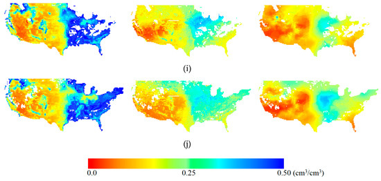 To further validate the SM estimation accuracy, the R, RMSE, MAE, and MRE values between the estimated and actual SM, as well as the number of samples in each month from January to October 2019, were calculated, as shown in Table 6. The R values in each month were distributed between 0.787 and 0.943, and the RMSE, MAE, and MRE values in each month in 2019 were all lower than 0.063 cm3/cm3, 0.054 cm3/cm3, and 46.7%, respectively, indicating that the SM estimation accuracy in the U.S. was generally high during all months. The SM estimation accuracy varied in different months. The highest SM estimation accuracy was found in February (R = 0.943, RMSE = 0.030 cm3/cm3, MAE = 0.022 cm3/cm3, and MRE = 10.4%), followed by January (R = 0.913, RMSE = 0.040 cm3/cm3, MAE = 0.031 cm3/cm3, and MRE = 15.4%). The worst accuracy was found in September (R = 0.862, RMSE = 0.063 cm3/cm3, MAE = 0.054 cm3/cm3, and MRE = 46.7%), followed by October and August. In conclusion, the established MBPNN-3 model yielded accurate and acceptable SM estimations in all seasons and can be employed to improve the monitoring accuracy of regional surface soil moisture.