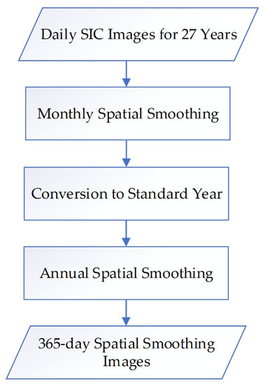 In order to remove the influence of dynamic factors, this study proposed a temporal spatial smoothing algorithm to smooth the passive microwave SIC products for many years. This algorithm is based on spatially filtered fields, and uses a combination of median filtering and mean filtering to remove dynamic factors from the SIC products. In addition, leap years have to be accounted for in order to unify the data format. The main idea of the algorithm is to perform multiple spatial smoothing processes in the time dimension for each pixel. The algorithm flow is shown in Figure 1.
