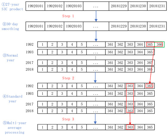 This spatial smoothing processing can be divided into three main steps. Step 1 consists of monthly smoothing processing: That is, in order to remove the influence of dynamic factors over a period of 30 days, the value of each pixel is taken as the median value of the pixel in the 15 days prior to and 15 days after the day in question. Step 2 turns the year into a standard year: To deal with the leap year problem, the mean value of each pixel over two consecutive days is taken as the value of the previous day’s pixel. Thus, in the case of a leap year, the mean for day 365 is the average of days 365 and 366, such as the leap year of 1992 shown in Figure 2. Step 3 is the annual smoothing process: To remove the influence of annual random factors, the median value of a pixel value on the same day of the year over a period of 27 years calculated to obtain 365 days of annual averaged data. As shown in step 3 of Figure 2, the pixel-based median processing is performed on all the 363 days of 27 years to obtain the spatially smoothed SIC data of the 363th day. This algorithm can retain detailed information about multi-year data and data trends. By using this multiple spatial smoothing algorithm to obtain annual SIC spatial smoothing products that are not influenced by dynamic factors, subsequent analysis of the annual trends in sea ice and polynyas is possible.