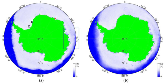 The threshold segmentation method can effectively extract targets from different gray-scale ranges and is applicable to the extraction of polynyas from SIC products. Polynyas are non-linear areas of open water or thin ice up to 0.3 m thick. The effectiveness of the 75% ice concentration threshold was determined by interactive analysis of the experimental winter images. For the extraction of polynyas and sea ice regions, this paper used the threshold segmentation method. Pixels with ice concentration values less than or equal to 75% were classified as polynya and where the ice concentration is 20% or greater classified as sea ice [35]. Specifically, the Antarctic continental margin was extracted firstly for the extraction of coastal polynyas, and then a 15-pixel buffer along the outside of this line was constructed; areas with this buffer with values of less than 75% were then considered to be the coastal polynyas extent. Denoising treatment was carried out on the extracted polynyas and sea-ice areas. In addition, there are two ice floes that persist for many years in the Antarctic coastal areas that have low SIC in the inversion of the SIC products (marked with two black circles in Figure 3a). In order to avoid being mistakenly identified as polynyas, these two areas were masked.