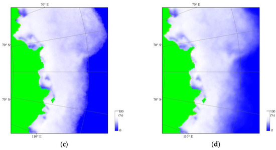 Comparison of the spatial smoothing and the pixel-based averaging results on October 20. (a) represents the final annual data on October 20 that have been spatially smoothed using 27-year SIC products, and (b) shows the result based on the average of pixel values of SIC data on October 20 in 27 years, which is provided for comparison. (c) is an enlarged image of the blue rectangular area of (a), and (d) is an enlarged image of (b) at the same position within the frame.
