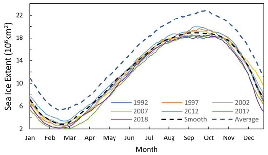 Comparison of the sea ice extent over 365-day periods. The black dotted line represents the sea ice extent obtained by applying the spatial smoothing algorithm to data from 1992–2018; the blue dotted line represents the sea ice extent obtained using the pixel-by-pixel means. The sea ice extent from the original data for 1992, 1997, 2002, 2007, 2012, 2017, and 2018 was used as a reference.