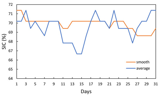 By comparing the October sea ice percentages for one pixel point obtained using the two methods (Figure 5), it can be seen that the values obtained by spatial smoothing are less volatile than those obtained using the pixel-by-pixel averages. In the case of the former, the changes are more stable and the sudden changes in sea ice values on individual days are not present, which greatly reduced the impact of sea ice mutation caused by changes in dynamic factors, such as the short-term climate.
