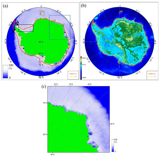Analysis of the extracted outer edge of the area of low coastal ice concentration and the edge of the seabed topographic threshold. (a,b) show the extraction results for the outer edge of the region of low coastal ice concentration and the edge where the abrupt change in the seabed occurs. The results were obtained using a processed SIC product as the base map (a) and the seabed elevation from Bedmap2 as the base map (b). The yellow line represents the outer edge of the area of low ice concentration, and the red line represents the line where the seabed drops steeply. (c) is an enlarged image of the blue rectangular area of (a).