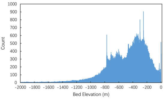 It can be seen that almost all of the coastal polynyas correspond to areas that are between −1200 and 0 m above sea level and 88.81% of the polynyas correspond to the bed elevation range −800 to 0 m. There are two peaks in the distribution of coastal polynyas, ranging from −800 to −550 m and −500 to −150 m, respectively.