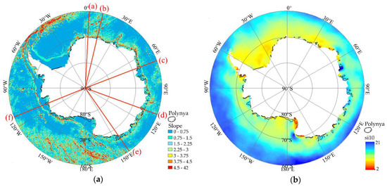 Distribution of coastal polynyas on slope and winds. (a) shows the distribution of coastal polynyas on slope. The six red lines (a–f) represent the locations of the six meridional sections, which are located at 3°E, 12°E, 69°E, 110°E, 145°E, and 112°W, respectively. (b) shows the distribution of coastal polynyas on winds.