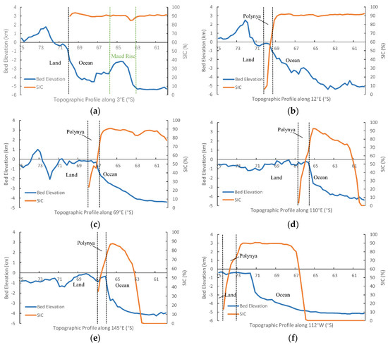 In order to analyze the distribution of the polynya in relation to the topographic profile of the local seabed, this paper performed a topographical profile analysis of the spatially smoothed SIC data on 20 October after re-sampling and the Antarctic seabed data. According to the distribution of the polynyas and the distance of the two curves, we selected six representative meridional sections (a to f) in the SIC data in order to display the sea ice and the bed elevation. The locations of the six meridional sections are at 3°E, 12°E, 69°E, 110°E, 145°E, and 112°W, as shown in Figure 9a. Section (a) passes through the Maud Rise, and sections (b–e) pass through a polynya where the seabed changes abruptly.
