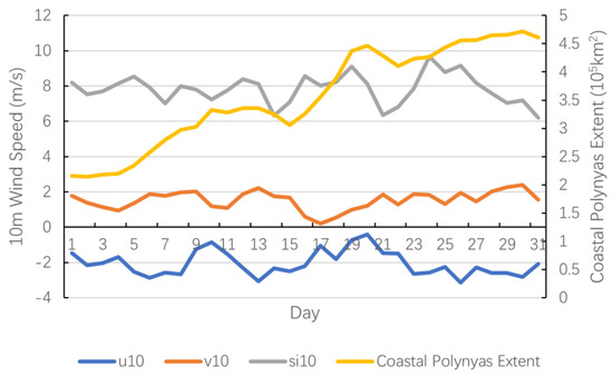 Surfaces winds directly affect the formation and distribution of polynyas at coastal locations along the Southern Ocean [34]. The horizontal and vertical distribution of wind are important factors for studying the stability of coastal polynyas. Three types of wind variables were selected to analyze the impact on coastal polynyas. Taking October 2018 as an example, the 24-h data of the three wind variables in a day were averaged to represent the average wind speed on that day. The distribution of coastal polynyas was compared with the three daily averaged wind speed variables of the region in October 2018 in Figure 11. The coastal polynyas extent was extracted with the original SIC products in October 2018.
