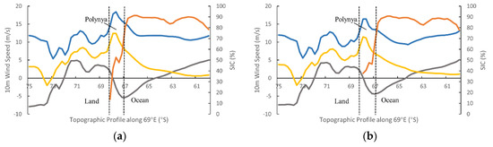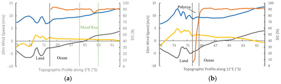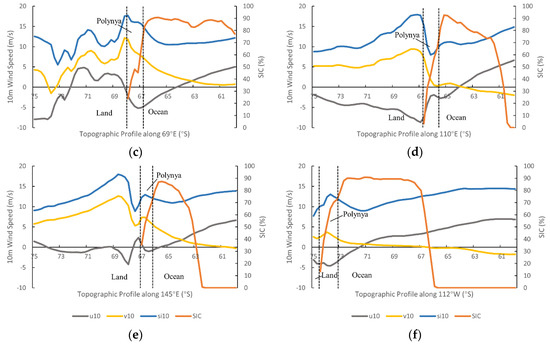 It can be seen from Figure 12 that at the edge of the coast and land, the variation trend of the si10 wind speed in most areas is generally consistent with the v10 component, and just opposite to the u10 component. The wind speed of the v10 component remains constant or decreases slightly while the increase of the u10 component causes the si10 speed to increase at the depth of the ocean. Most sections experienced a process of the wind speed decreasing first and then increasing sharply near the location of the coastal polynyas. Additionally, this wind speed change location is also the location where the bed elevation changes abruptly in most areas.