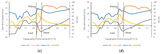As can be seen from Figure 13a–d, the three variables of wind speed as a whole have a consistent trend. The wind speeds of si10 and v10 show signs of decline from Figure 13a–d, especially in the location of the coastal polynya. There are signs of sea ice melting at the coastal polynya, especially the thin ice near the land, which even melts into the sea water.