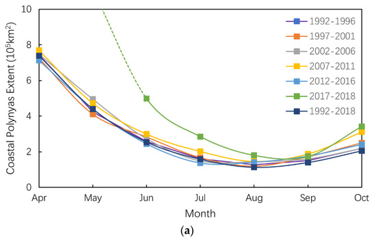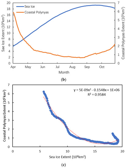 Changes in sea ice throughout the Southern Ocean directly lead to changes in the extent of coastal polynyas. The statistics of the extent of sea ice and coastal polynyas are shown in Figure 14b. As the sea ice area increases, the area of coastal polynyas gradually decreases. The largest extent of sea ice occurs in August and September while the coastal polynyas cover the smallest extent in July and August. The extent of coastal polynyas decreases to a minimum one month later than the sea ice reaches its maximum. This is probably because the polynyas occur close to the Antarctic continent, and are easily affected by the temperature of the land. The Antarctic continent heats up quickly because of its low heat capacity while the heat capacity of the ocean leads to a slower temperature rise. This causes the sea ice to melt about a month later [9]. In addition, when winter begins (April–May), the waters near the coast gradually freeze, and the polynyas extent drops rapidly. From June to August, the sea ice extent continues to expand while the extent of the polynyas remains basically unchanged. As the sea ice begins to melt in October, the polynyas extent grows rapidly. Therefore, after a certain point, the polynyas extent will not continue to decrease as the sea ice expands and, once the sea ice begins to melt, the extent of the polynyas will increase rapidly.