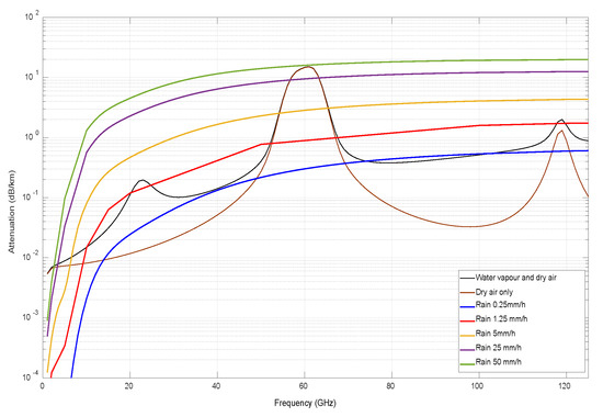 Frequency-dependent attenuation of electromagnetic radiation in standard atmosphere (barometric pressure 1013 mbar, temperature 15 °C, water vapor density of 7.5 g/m3) and rain attenuation in dB/km at various rainfall rates.