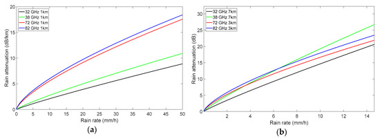 The theoretical rain-induced signal attenuation for various rain rates at different frequencies: (a) per kilometer; (b) over a 7-km long 32 GHz 2 × 2 line-of-sight multiple-input multiple-output (LOS-MIMO) link, a 7-km long single-input single-output (SISO) 38 GHz link, a 3-km long 72 GHz link, and a 3-km long 82 GHz test link using our measurement scenario.