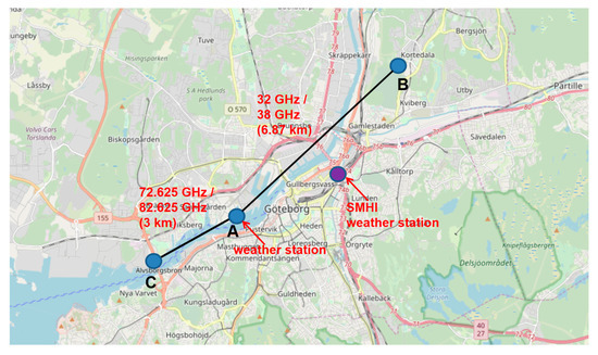 All the mmWave links have a sampling interval of 30 seconds. Rain, humidity, temperature, air pressure, and wind information were provided by a weather station equipped with a rain gauge located at the rooftop of the Ericsson building. The accuracy of the rain gauge is of the order +/− 3% [39]. We used the measurement from this rain gauge for the analysis in the results section. As this weather station was located on the rooftop, we also selected the closest rain gauges operated by the Swedish Meteorological and Hydrological Institute (SMHI). The SMHI rain gauge reported the cumulative rain amount in mm over 1 day and its location is indicated in Figure 3.