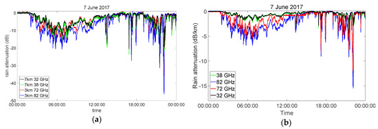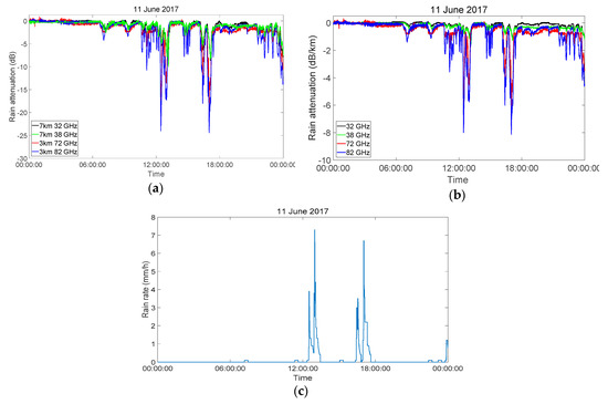 The received signal variation and the rain intensity on 7 and 11 June 2017 are presented in Figure 4 and Figure 5, respectively. Assuming other losses (wet antenna attenuation, water vapor attenuation, etc.) are the same, the average signal attenuation values over 1 km distance are also compared in Figure 4b and Figure 5b, which show more clearly the impact of rain on links at different frequencies. The measured rain attenuation result is consistent with the theoretical predictions in Table 2. Although the 32 and 38 GHz links were built over a much longer distance compared to the E-band links, the rain-induced attenuation in the 32 and 38 GHz links was lower. This difference in rain-induced attenuation between the lower and higher frequency mmWave link becomes more significant as the rain intensity increases. The 32 GHz and 38 GHz links are more robust to poor weather conditions compared to the E-band link, although they are deployed over longer distances. The attenuation of the links, especially the E-band link, was a lot more severe than expected in late evening on 7 and 11 June. One possible reason is that the rain gauge provides a point measurement, while the measured signal attenuation is caused by the rain along the link. Although one side of all links is located on top of the same building, the links are built across different and wide areas, with a separation distance of up to 10 km. The rain intensity that each link experienced along the path could be very different from the rain gauge measurement, and it could contribute to the difference in attenuation value. In addition, the rain gauge that was used for the analysis was located on the rooftop of a building. There could be a significant under catch of rainfall in the gauge especially during windy conditions, and more rainfall could have been detected by the mmWave link.