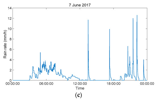 The widely deployed microwave links from existing cellular networks have become installation-free facilities, and they can be particularly useful for applications in urban hydrology and in supporting monitoring in flood-prone urban areas. Rain gauges have high accuracy but the measurement data is collected at the point scale. Because of the temporal and spatial variability of rainfall, especially in the heavy rain and flooding events, the changes of rain rate occur at very short time intervals. Even in dense urban areas, the density of rain gauges is often not sufficient to capture significant variation in observed rainfall. Radars and satellites can monitor over much wider areas, but the estimates from those sources are less accurate at near-ground levels, and the temporal and spatial resolution is not sufficient for flood monitoring purposes. The measurements presented here records a received signal level measurement every 30 seconds, producing 10 rain rate estimates within 5 minutes, which is usually the time resolution of weather radars. Microwave backhaul links can measure near-ground rain rates more accurately with high time resolution, which could assist in flash flood warnings [43,44,45], as the wireless networks exist over large regions of land, including complex topographies, where traditional monitoring equipment cannot be easily installed. Therefore, this technology could also be very useful in cities that lack monitoring of rainfall by radar. As more mmWave links are expected to be widely deployed in cities, those densely deployed links can all be used for rainfall monitoring, and the amount of rainfall estimation data will be impressively large. These links can be further processed using standard interpolation methods to create rainfall maps, or combined with other existing monitoring networks based on radars and rain gauges to produce high temporal and spatial resolution rainfall maps [46].