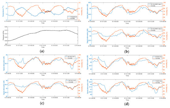 (a) The variations in temperature, humidity, and pressure during 13-15 June, 2017. (b) The variations in the signal attenuation and humidity of the 32 GHz link (link 1, data streams 1 and 2). (c) Links 1 and 2 at 38 GHz; (d) The 72.625 and 82.625 GHz links.
