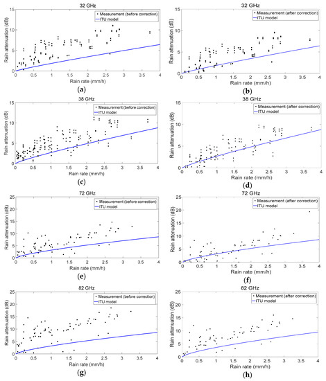 Rain attenuation statistics from the measurement before correction and after correction in comparison with the calculated rain attenuation, using the ITU model from Equation (9) for different frequencies: (a,b) 32 GHz; (c,d) 38 GHz; (e,f) 72 GHz; (g,h) 82 GHz.