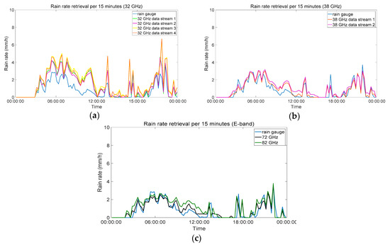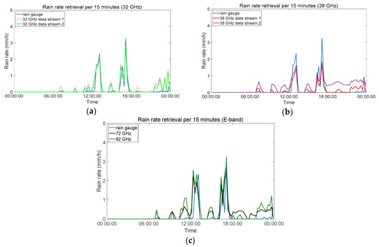Average rain rate per 15 min derived from the signal link compared with the rain gauge measurement on 7 June 2017: (a) 32 GHz link; (b) 38 GHz link; (c) E-band link.