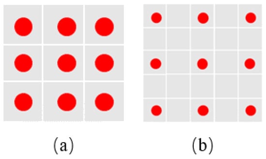 Examples of ordinary convolution and atrous convolution. Red dots in the grid represent weights, and non-red dots indicate that the grid has a value of 0: (a) an ordinary convolution with the size of ; and (b) an atrous convolution with the size of and the dilation rate of 2.
