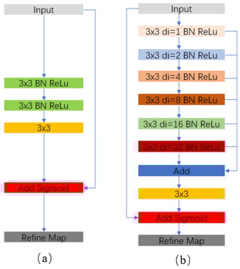The residual refinement module RRM_Lc based on local context information was originally proposed by Peng et al. [37], and is used to further refine the boundary. This structure is shown in Figure 3a. Although RRM_Lc can improve the accuracy of the boundary to a certain extent, due to the small number of network layers, it is impossible to extract deeper features of the input image. On the other hand, this structure does not increase the receptive field during feature extraction so that it cannot extract more global features. In high-resolution remote sensing images, there are a large number of large buildings with inconsistent tone and textures or complex shapes. When using RRM_Lc to extract features from the input image, the receptive field is not enough to contain the entire building and the surrounding background. Consequently, it is impossible to extract sufficient global features, which fails to handle the problems of incomplete building extraction and inaccurate building footprint extraction. Therefore, we propose a new residual refinement module RRM_Bu which has more layers and larger receptive field when extracting features.