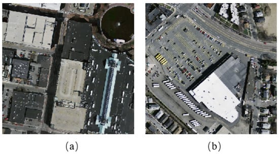 The dataset used in the experiments is the Massachusetts Building Dataset [24]. This dataset contains 151 aerial images of the Boston area. The size of each image is pixels and the resolution is 1 m. This dataset is already divided into three parts. The training set has 137 images, the validation set has 4 images, and the testing set has 10 images. The buildings in this dataset are mainly villas and commercial center buildings. There are many buildings with different tones and textures or complex shapes. Two types of buildings are shown in Figure 4.