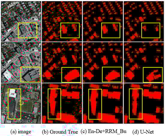 To evaluate the effectiveness of BRRNet proposed in this paper, several sets of comparative experiments were carried out on the Massachusetts Building Dataset. Firstly, we compared different network structures and different loss functions to determine the structure and loss function of BRRNet, then compared BRRNet with five state-of-the-art methods, and finally performed migration experiments of RRM_Bu.