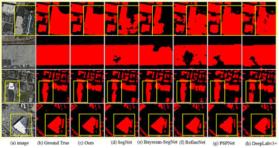 Comparative experiments with state-of-the-art methods. To further evaluate the effectiveness of our method, we compared BRRNet with five state-of-the-art methods including SegNet [26], Bayesian-SegNet [26], RefineNet [40], PSPNet [41], and DeepLabv3+ [42]. Table 3 shows the experimental results. It can be seen that our method gets higher scores than other methods in both IoU and F1-Score. Figure 7 shows the results of some typical buildings. The buildings in Rows 1 and 2 of Figure 7 are large buildings with inconsistent hue and texture. The results of the other five methods generally have the problem of incomplete building extraction. However, our method obtains much more complete results when extracting such buildings. The buildings in Rows 3 and 4 of Figure 7 have complex shape. In the results of the other five methods, the building footprints are generally different from the real results, and the details are not prominent. However, the results of our method show higher accuracy in terms of the building footprints, and the details are similar to the real results. Therefore, our method can effectively solve the problems of incomplete building extraction and inaccurate building footprint extraction of the buildings with complex shapes.