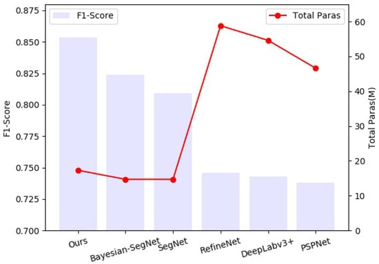 As shown in Section 3.4, we compared the efficiency of our proposed network BRRNet with five state-of-the-art methods on the Massachusetts Building Dataset, and experimentally demonstrated that BRRNet obtains the highest scores on IoU and F1-Score. In addition to IoU and F1-Score, the total parameters of the network is also an important metric for evaluating the efficiency of a network. The more the parameters the network has, the larger the memory it needs to occupy during the training and testing process. Therefore, we further analyzed the total parameters of the proposed network and the five other state-of-the-art methods. Figure 8 shows the total parameters of different networks and the F1-Scores evaluated on the Massachusetts buildings dataset. Figure 8 shows that the total parameters of Bayesian-SegNet and SegNet are the least. The total parameters of our proposed BRRNet are slightly larger than those of the two methods while it obtains significantly higher F1-Score. In contrast, RefineNet, DeepLabv3+, and PSPNet have much more parameters and require a lot of memory during training and testing. Our proposed BRRNet is based on the improvement of U-Net. The total parameters of U-Net is 31.0M, while the total parameters of BRRNet is only 17.3M because BRRNet removes the fourth block of the encoder and the first block of the decoder of U-Net, which greatly reduces total parameters. It can be seen that our proposed BRRNet can not only obtain good results in the task of building extraction, but also has a relatively few parameters.