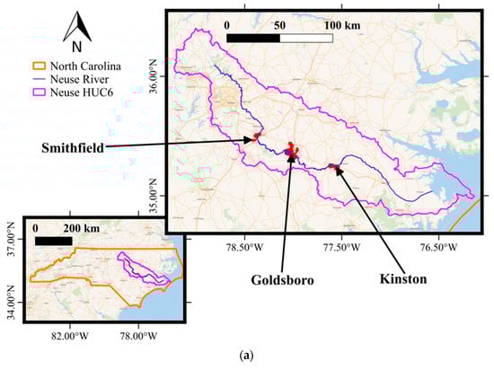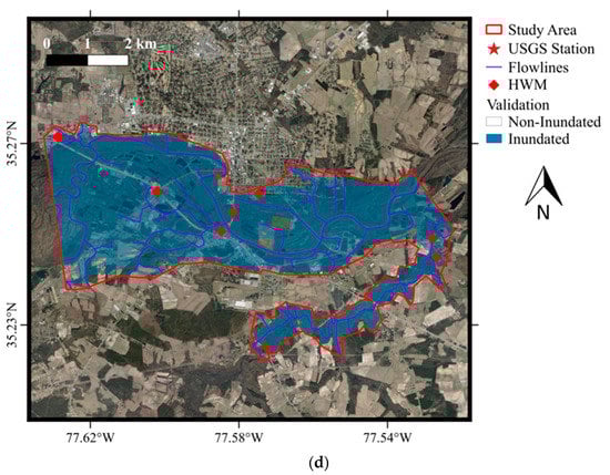 Neuse River Basin located within North Carolina (a) containing the three study sites Smithfield (b), Goldsboro (c), and Kinston (d). Each study site illustrates the high-water marks (HWM) collected by the United States geological survey (USGS), as well as the location of the USGS station. These data points were used to create the inundated areas within the study area boundaries.