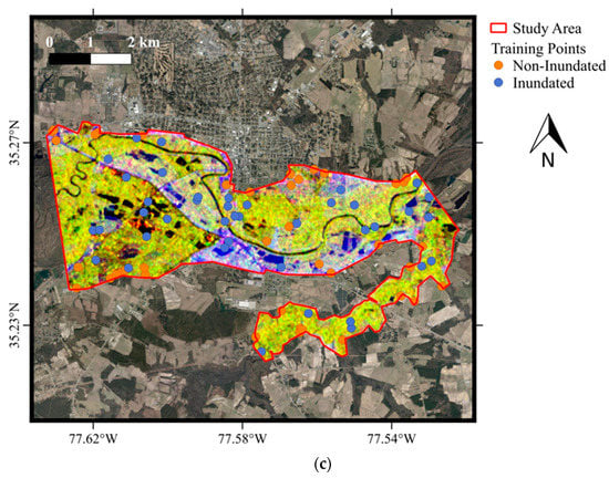 Uncertainties in this dataset can be attributed to a number of factors including the collection of the HWM, the DEM, interpolation techniques, anthropogenic structures, the number of HWMs collected, regions with low density of HWM, extrapolation of HWM elevations, and hydrodynamic effects not considered []. Temporal alignment with SAR is also an issue since the three sites peaked at different times []. For the case of the Goldsboro study area, Quaker Neck Lake in the western portion of the site was not included in the USGS inundated area despite there being evidence from the SAR and from stock aerial imagery that the lake is perennially inundated. To counter this limitation, the Quaker Neck Lake was added to the inundation validation dataset, as seen in Figure 1c. Nevertheless, the availability of this information along with the challenges associated with the sites make this a good case study for examining how HAND and machine learning methods could be leveraged for improving SAR based inundation mapping. Additional information for each site is listed in Table 1.