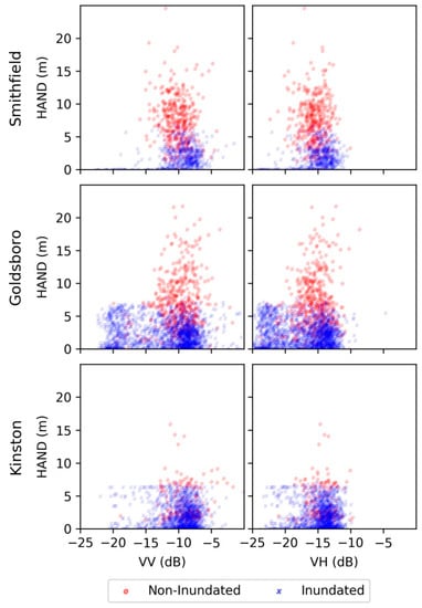 Three-dimensional scatter plots representing a 2% random sample of the feature set data for the three study areas Smithfield (top row), Goldsboro (middle row), and Kinston (bottom row). Plotting limits were set to −25 to 0 dB for VV and VH while HAND plotting limits were 0 to 25 m. Labels were set using the class from the validation dataset.