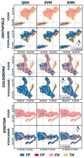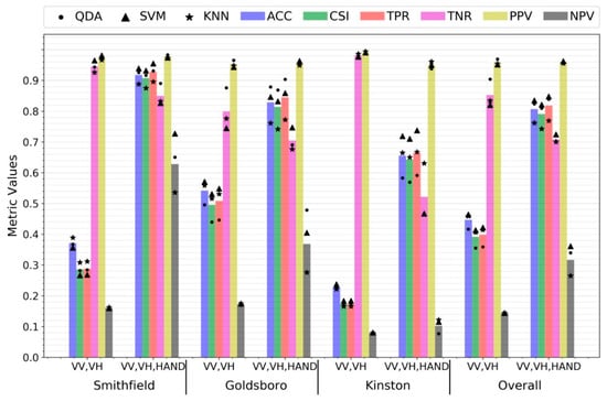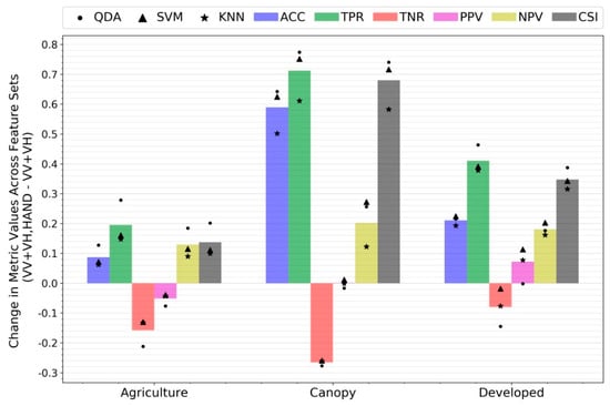 For most of the five secondary metrics considered, a considerable improvement was seen across feature sets for the different models and study areas as shown in Figure 7. Overall, ACC, CSI, TPR, and NPV saw the largest improvements of 44.7% to 80.7%, 39.2% to 79.1%, 39.8% to 81.9%, and 14.4% to 31.7%, respectively. A very marginal improvement of 95.8% to 95.9% was seen for PPV while TNR fell from 85.3% to 70.8%. The drop is associated with a reduction of TN and the complementary increase of FP which was seen across classifiers and study areas. On an overall basis for the VV, VH, HAND feature set, QDA, and SVM outperformed the KNN classifier.
