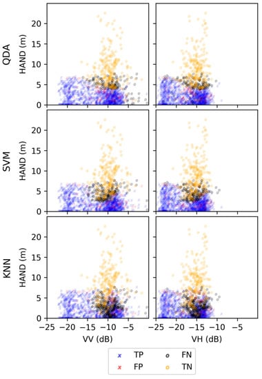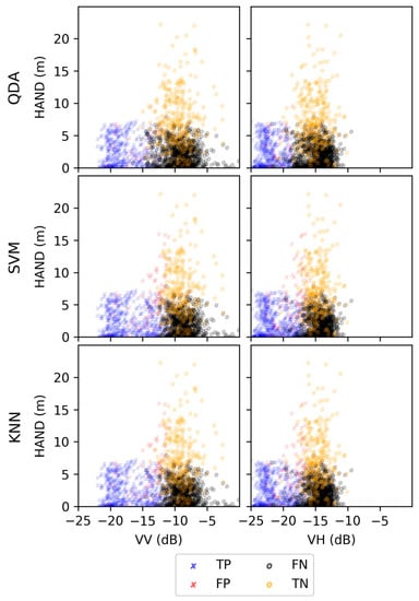 Plotting a randomly selection (≤ 0.2%) of the individual points and the resulting primary metric label for the Goldsboro study area in Figure 9 and Figure 10 illustrates the nature of the decision boundaries generated by the three classifiers employed and the relationship between HAND and VV or VH backscatter. Figure 9 illustrates the boundaries for the VV and VH feature set, while Figure 10 shows the boundaries for the VV, VH, and HAND feature set. Since TP and FP correspond to predicted inundation and TN and FN correspond to predicted non-inundation, the boundary between the two groups aligns with the decision boundary roughly speaking. The SAR only feature sets show decision boundaries that are near vertical, which is expected since HAND is not considered in the training. Incorporating HAND changes the nature of the boundaries to vary across the HAND axis as well. For all three classifiers in the HAND feature set, the decision boundaries tend decrease in HAND values as the backscatter values increase but the trend levels out or begins to increase again as the backscatters continue to increase. This creates an upwardly concave decision boundary. The decision boundaries for QDA and SVM are much more evident and abrupt than the decision boundary for KNN. This is due to the properties of QDA and SVM as discussed in the methodology where QDA develops a quadratic boundary and SVM with a radial basis kernel generates a non-linear boundary that maximizes the margin between classes. KNN creates more local boundaries determined by local relative densities of points, which results in more irregular boundaries, which is also seen in the spatial results in Figure 5.