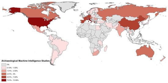 Despite these abilities, there are imbalances in the use and development of MI methods for archaeological remote sensing throughout the world. Specifically, these methods are highly utilized by researchers in the Global North (e.g., United States and parts of Western Europe), but other regions produce very few studies, in comparison, dealing with archaeological MI applications for remote sensing (Figure 2). Elsewhere, my colleagues and I have discussed this issue, illustrating that important developments in automated archaeological procedures have been underrepresented in archaeological literature from developing countries, particularly those in the Southern hemisphere [,]. However, robust quantitative evaluation of the problem within archaeology has not yet been undertaken.