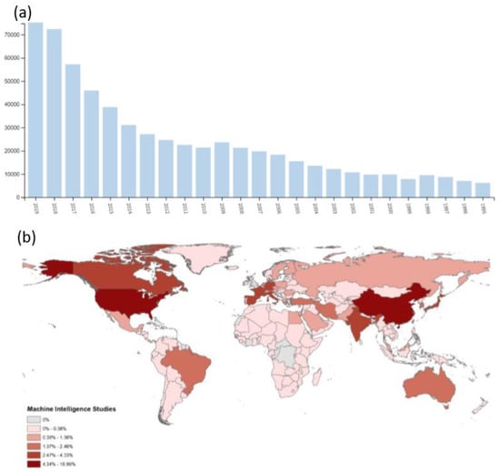 Quantity and geographic distribution of MI research (n = 621,630). (a) Graph of the total number of publications on MI work in all disciplines since the 1990s included in the Web of Science database. (b) Geographic distribution of MI studies in panel (a), indicating a concentration of development in North America, China, and parts of Europe (primarily in the West). South America and Africa contain the lowest percentage of MI research output. This result concurs with Microsoft Academic search queries.
