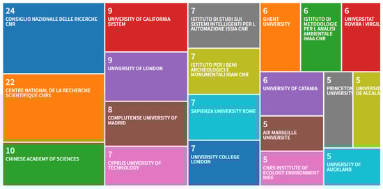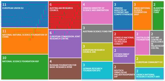 One potential reason for this imbalance stems from funding opportunities [,]. When analyzing published archaeological MI literature in Web of Science, most studies were conducted by affiliates of France’s Centre National de la Recherche Scientifique (CNRS), Italy’s Consiglio Nazionale delle Ricerche (CNR), the Chinese Academy of Sciences, and the University of California system in the United States (Figure 4). Similarly, most research has been funded by USA and European agencies, with China and Australia also making notable contributions (Figure 5), and this trend is followed by MI research, generally.