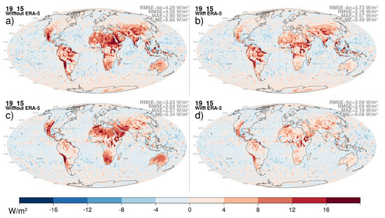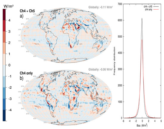 Finally, Figure 11 shows comparisons with CERES SYN1deg when the OLR was estimated with Equation (2), i.e., when the AVHRR/1 instrument was used, which did not provide Channel 5 observations. To ease the comparison, the results with both Channels 4 and 5 are also shown (top panels). When Channel 5 was not available (bottom panels), the bias-corrected RMS difference of the monthly mean increased from about 1.7 Wm−2 to about 1.9 Wm−2.