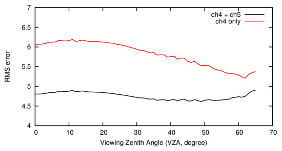 Variation of the RMS error as a function of the Viewing Zenith Angle (VZA) for the two-channel regression with Equation (1) (black) and the regression without Channel 5 (red curve).