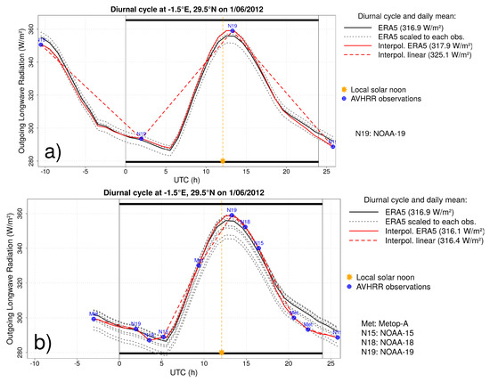 Figure 5a shows an illustrative OLR diurnal cycle from ERA5 (black curve) together with the AVHRR observations from NOAA-19 acquired during this time period (blue dots). For each AVHRR observation, a factor was determined between the ERA5 and the observed OLR, which was used to scale the entire ERA5 diurnal cycle (dotted grey curves). These scaled diurnal cycles were then temporally interpolated (inversely weighted to their temporal difference) so that the cycle passed exactly through all observations (red curve). This was only done for observations over land that were considered “clear-sky” by both AVHRR and ERA5 (as was the case for all observations in Figure 5); for all other cases (i.e., ocean or cloudy), the observations were linearly interpolated (dashed red curve). The daily mean, and later the monthly mean, could then be estimated by averaging the interpolated diurnal cycle (dashed/solid red curves) over the entire day, i.e., 0–24 h UTC. In this example, the linear interpolation of observations resulted in a daily mean of 325.1 Wm−2 (dashed red curve), while the ERA5-scaling interpolation significantly decreased the daily mean by 7.2 Wm−2 to 317.9 Wm−2 (solid red curve).