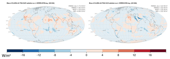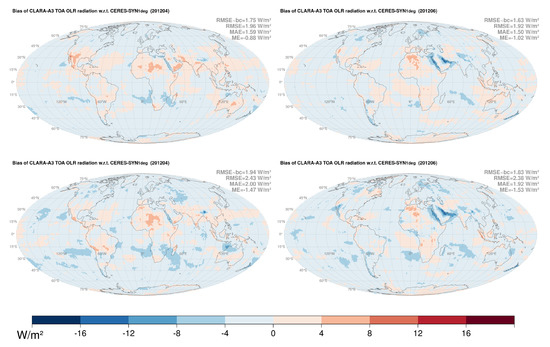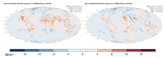 Table 3 provides some statistics for Equations (1) and (2), per satellite separately. The biases remained moderate, an indication of a good intercalibration of the thermal channels for the three satellites and a good consistency between the CERES instruments on Terra and Aqua. However, Equation (1) applied to NOAA-19 showed a negative bias (underestimation of the OLR) of 0.77 Wm−2, which was about 0.35% of the average OLR. Concerning the RMS error, NOAA-17 showed slightly better results than NOAA-18 and -19. This could indicate better performance of the AVHRR instrument on this satellite (e.g., less noise), but was more likely related to the fact that NOAA-17 is a morning satellite, when the estimation of the instantaneous OLR is less affected by the daytime warming of the land surface.