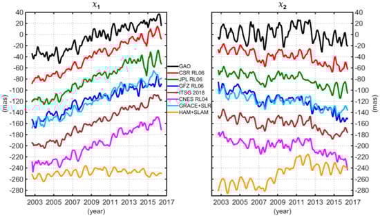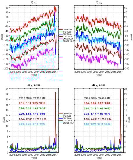 The GRACE observations of changing Earth’s mass redistribution improve the understanding of the signals in polar motion (PM) excitation caused by time-variations in the Earth’s mass distribution. After removing tidal effects (atmospheric, ocean, solid Earth, and pole tides), as well as non-tidal atmospheric and oceanic contributions from the GRACE-based geopotential coefficients, the remaining signal is mostly an indication of the land hydrosphere [22], glacial isostatic adjustment (GIA) [23], barystatic sea-level contributions [24], and earthquake signatures [25]. GRACE-based PM excitation has been assessed before [8,12,15,16,26,27,28,29,30], but considerable differences were found among the processing centers.