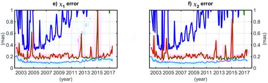 Initially, we display time series of GSMAM computed using different GRACE solutions and GRACE + SLR, without applying any filtering (Figure 1a,b). The series have quite similar character with strong positive trends in χ1, weaker negative trends in χ2, visible annual variation, and some other oscillations of periods both shorter and longer than annual. It is obvious that GRACE + SLR series are less noisy than GSMAM from GFZ RL06 solution. Notably, after 2016, the series became more noisy, as the accuracy of GRACE decreased due to a change in thermal control of the spacecraft due to the increasingly limited battery capacity. In 2017, one accelerometer was turned off and that caused a further degradation of the results, especially visible for GFZ and ITSG solutions. Figure 1 gives also formal errors of estimated χ1, χ2, which were computed from the errors of ΔC21, ΔS21 coefficients (Figure 1c–f) (errors for CNES RL04 were not available). It is visible that the best GRACE performance occurs in the years 2006–2013, and before and after this period the error values are higher and noisier. During the entire 15-year GRACE operational period, some peaks of visibly higher errors occurs typically related to occasional periods of short repeat orbits. Compared to other GRACE solutions, the CSR RL06 series has the lowest and the most stable errors of χ1 and χ2. However, the errors of GRACE + SLR series are even lower. Notably, after 2005, the errors of GFZ-based excitation series start to increase almost linearly.